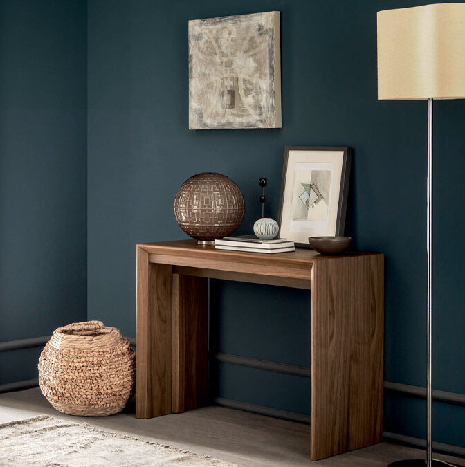 Consolle estensibile in laccato o legno, meccanismo telescopico in alluminio, 3 o 5 allunghe. Gambe centrali di supporto girevoli in tinta con la consolle.
