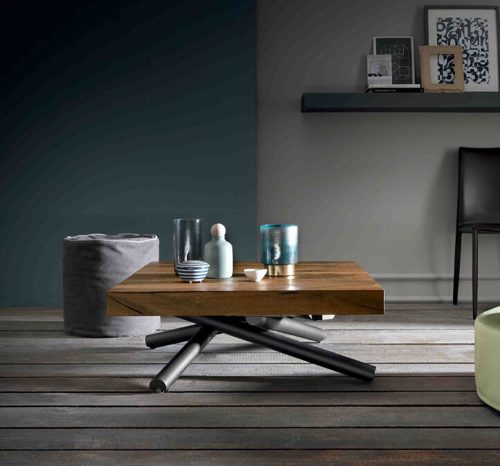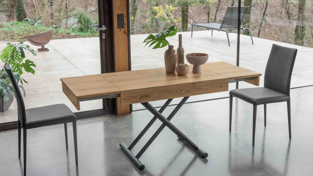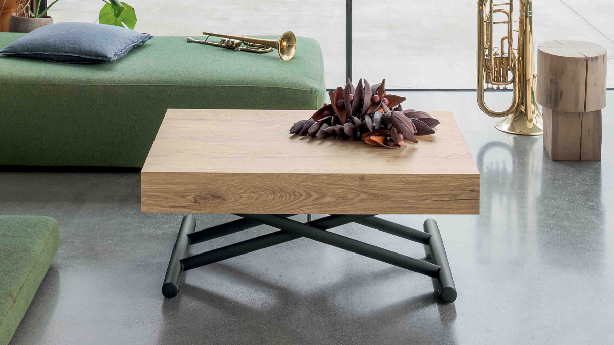 Tavolino trasformabile in tavolo da pranzo, base in metallo, meccanismo a gas, regolabile in altezza al millimetro da cm 25 a cm 84, piano rettangolare in nobilitato, legno o effetto malta, con 2 prolunghe interne a libro. Ruote a scomparsa.