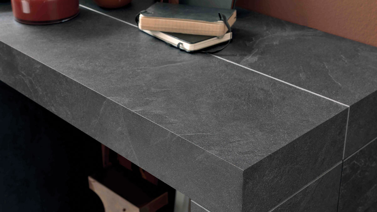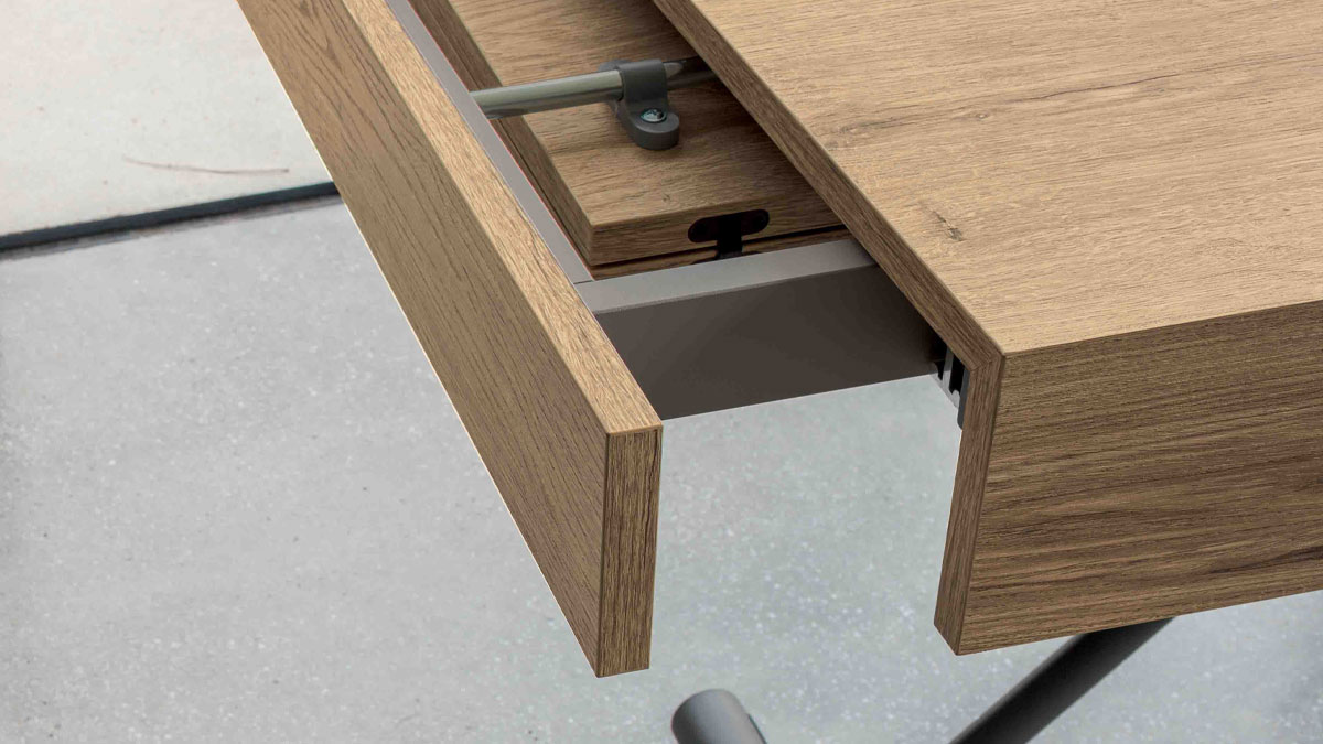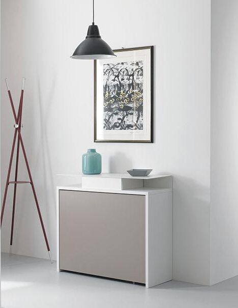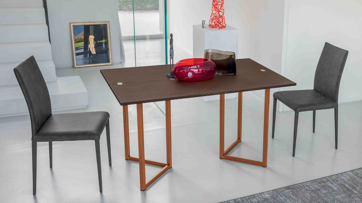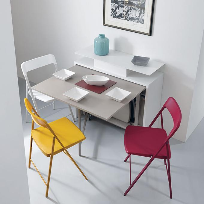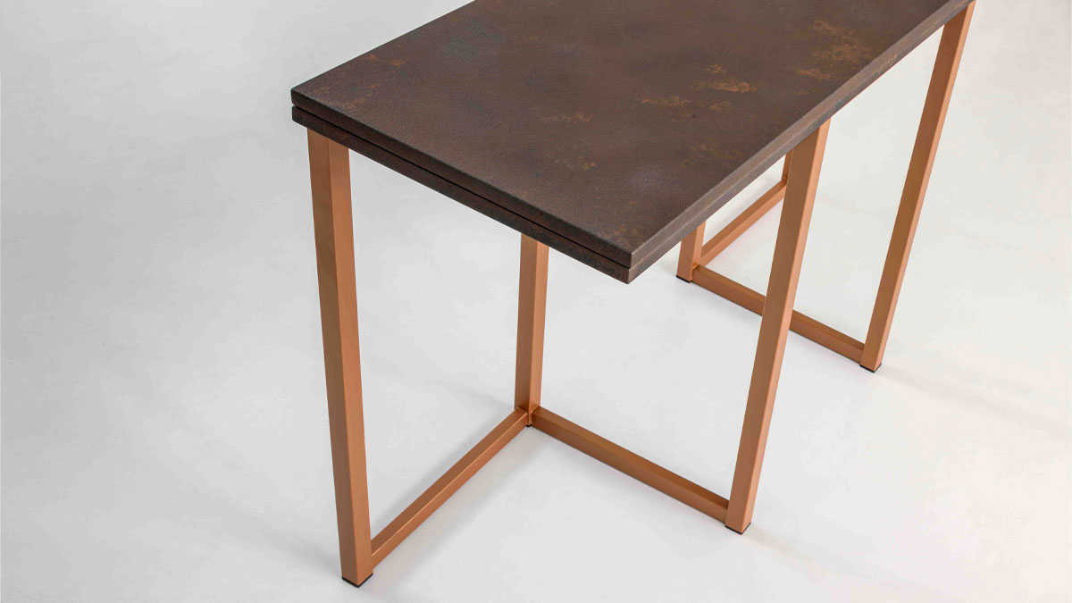 Consolle con cassetto. Top in acciaio verniciato sablé, struttura in laminato Ecologico 25 mm - 0/402 Tavolo chiudibile porta sedie (porta 6 sedie chiudibili). Struttura in acciaio verniciato e ripiano in laminato Ecologico da 18 mm (cm 170 x 90 x 73h aperto - 90 x 34 x 73h chiuso).