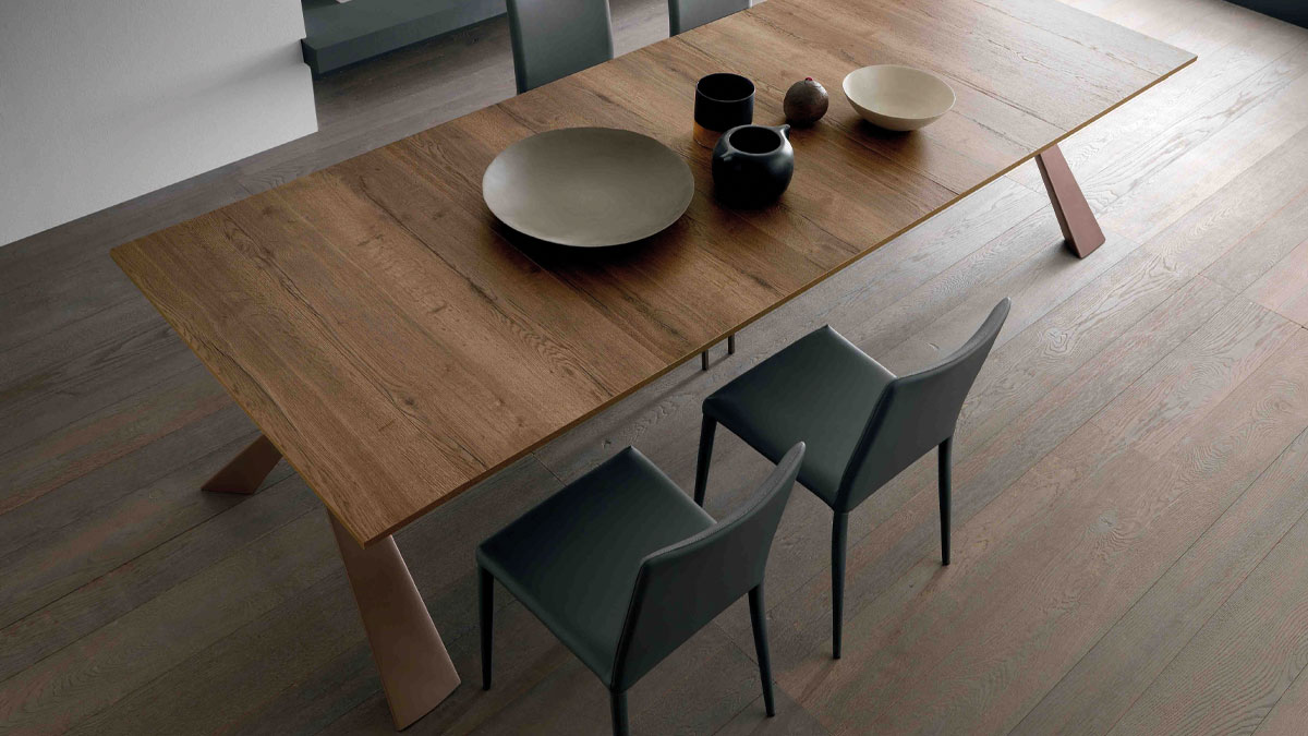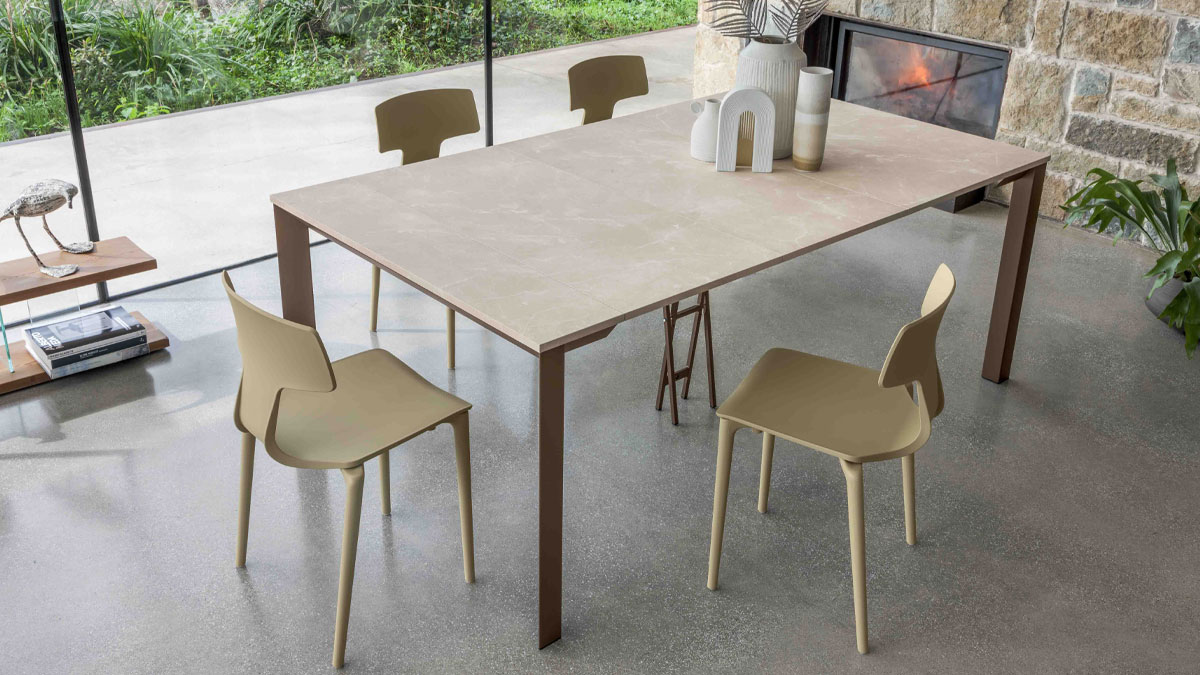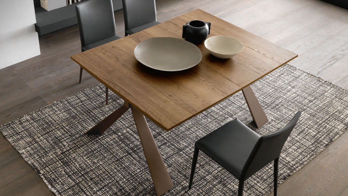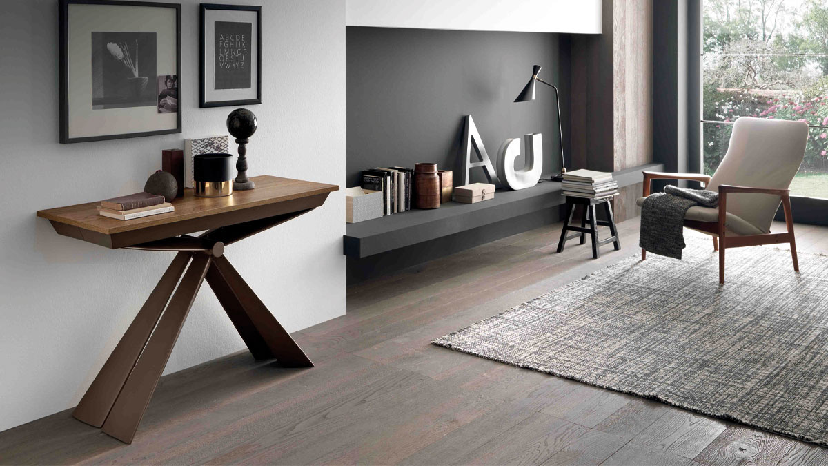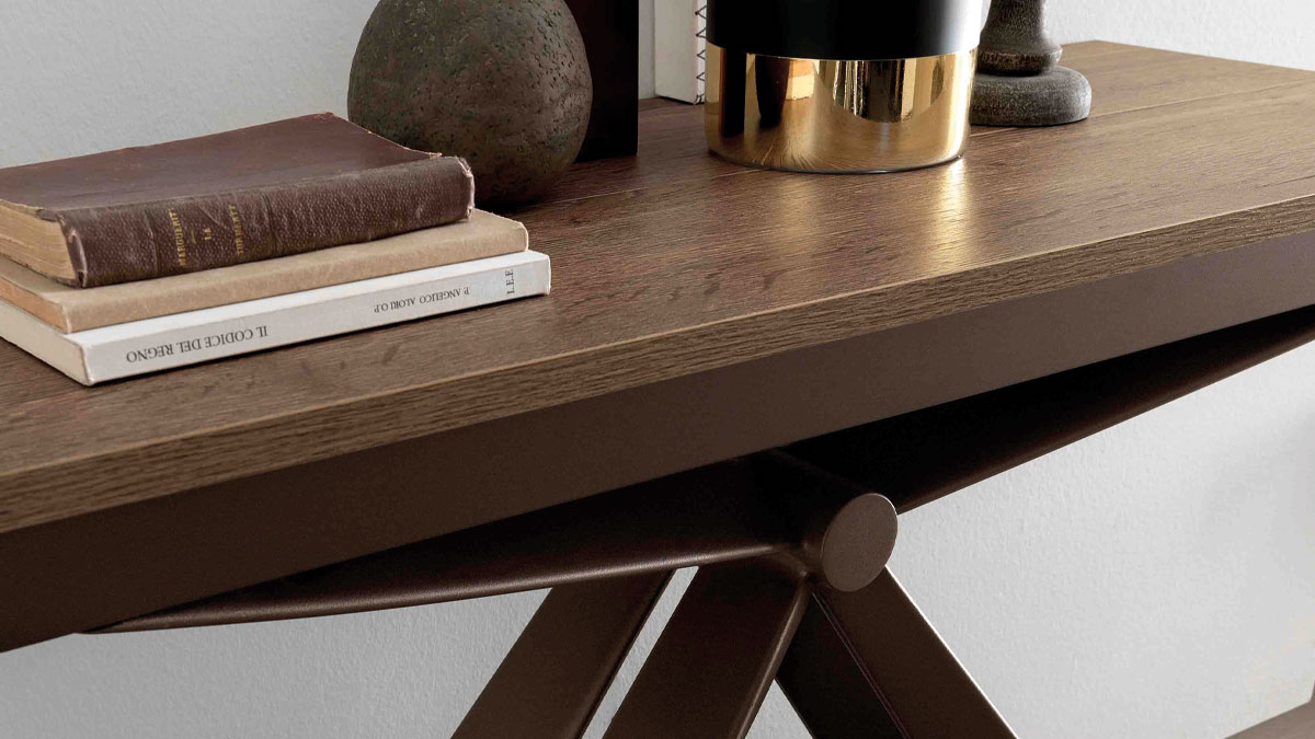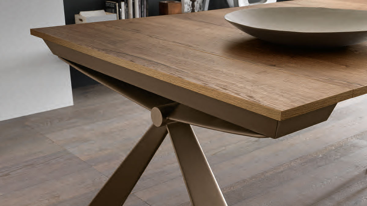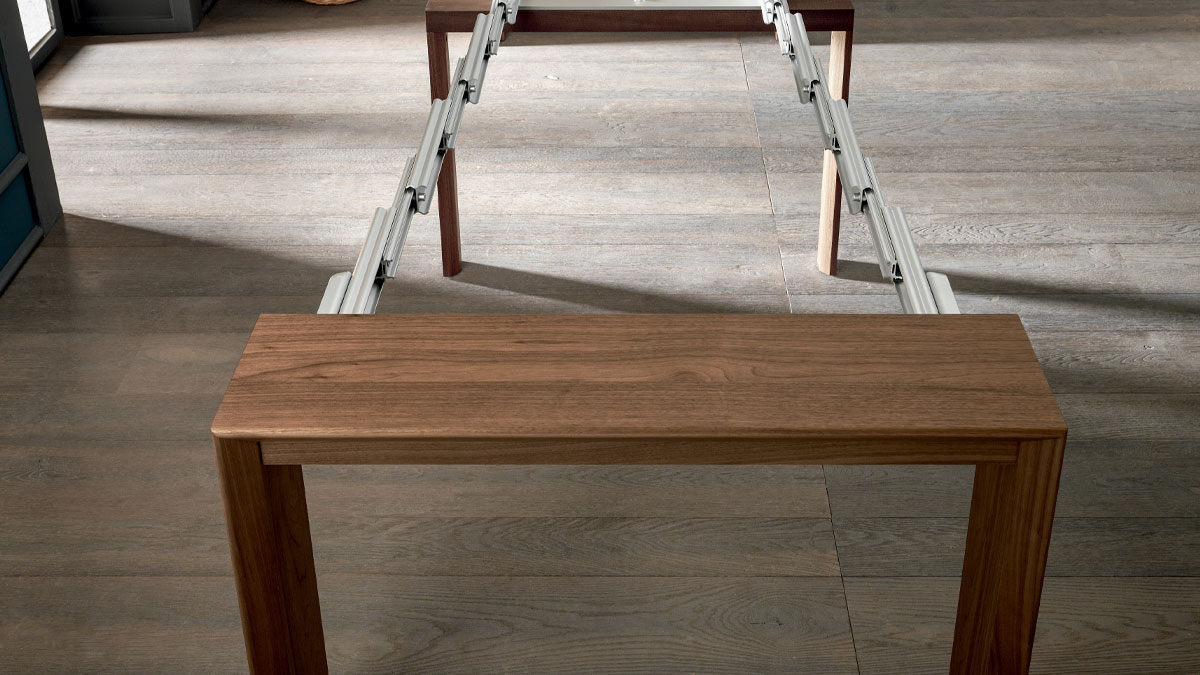Consolle estensibile, struttura in metallo, meccanismo telescopico in alluminio, piano in nobilitato, laccato, legno, effetto malta o ceramica, 3 o 5 allunghe. Gambe centrali di supporto.