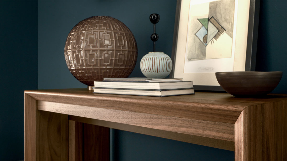Consolle estensibile in laccato o legno, meccanismo telescopico in alluminio, 3 o 5 allunghe. Gambe centrali di supporto girevoli in tinta con la consolle.