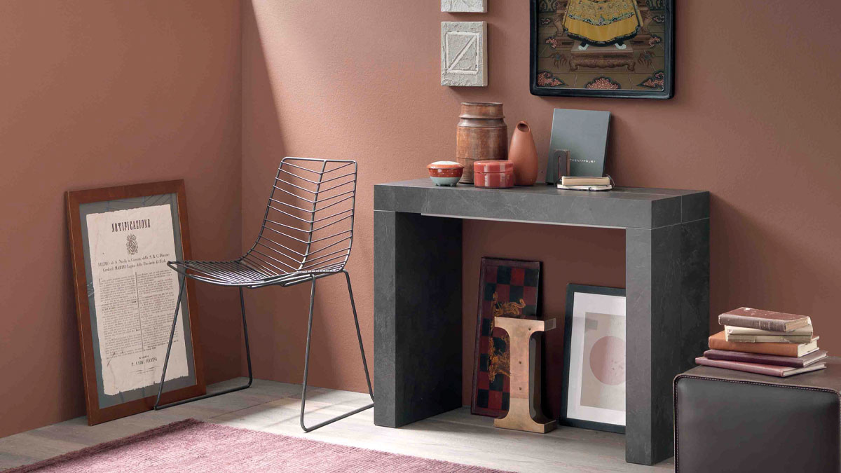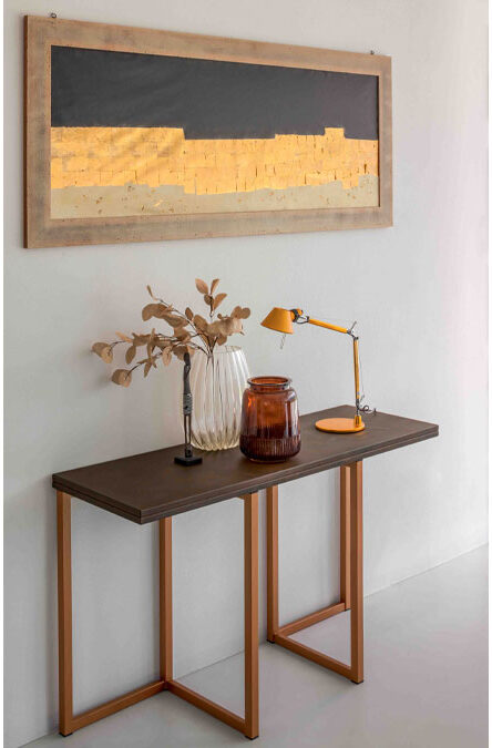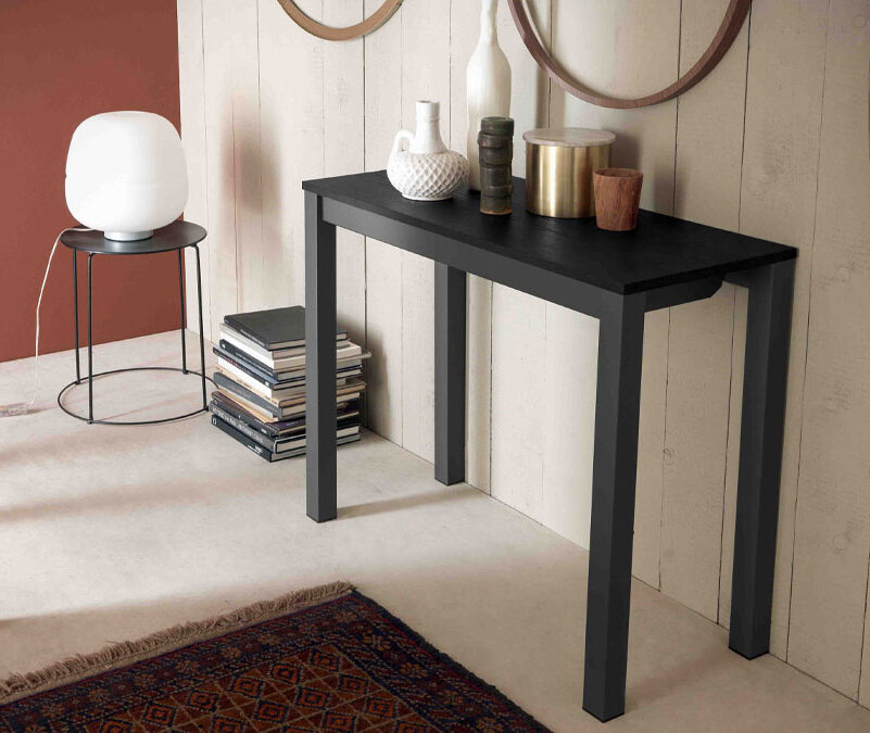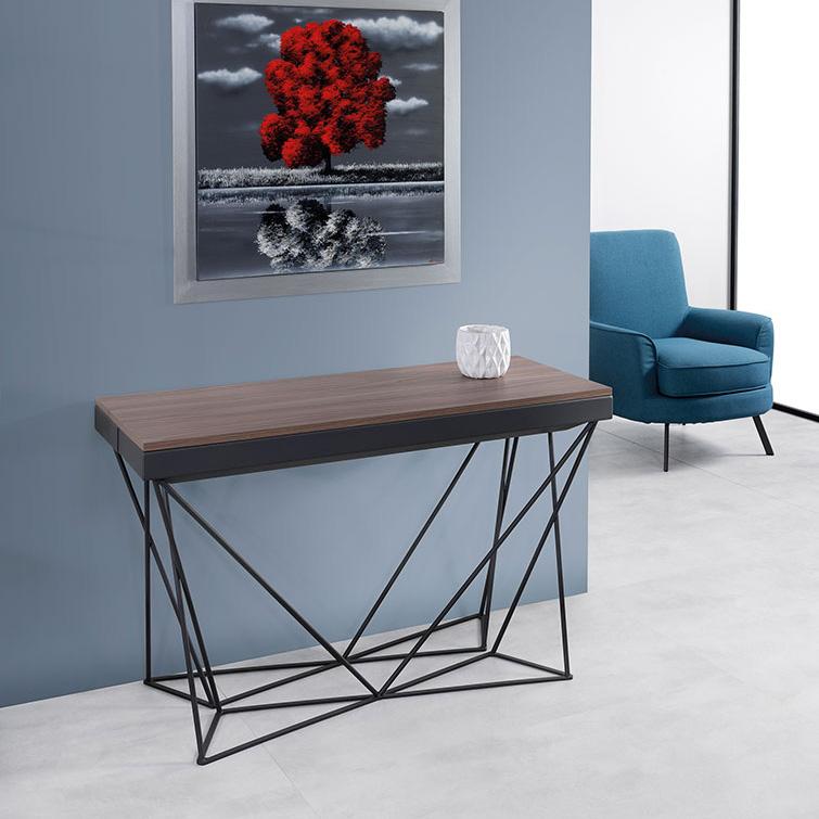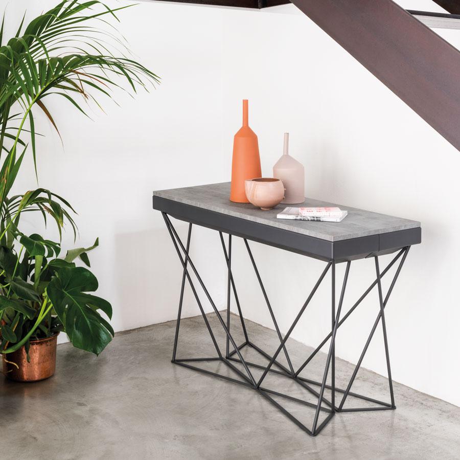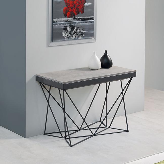 Consolle estensibile, struttura in metallo, piano raddoppiabile a libro in nobilitato o effetto malta.