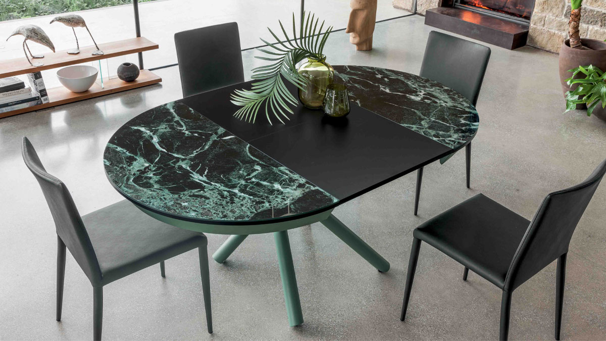 Tavolino trasformabile in tavolo da pranzo, base in metallo, meccanismo a gas, regolabile in altezza al millimetro da cm 36 a cm 75, piano rotondo in nobilitato, legno, vetro, effetto malta e ceramica, prolunga interna a libro. Ruote a scomparsa.