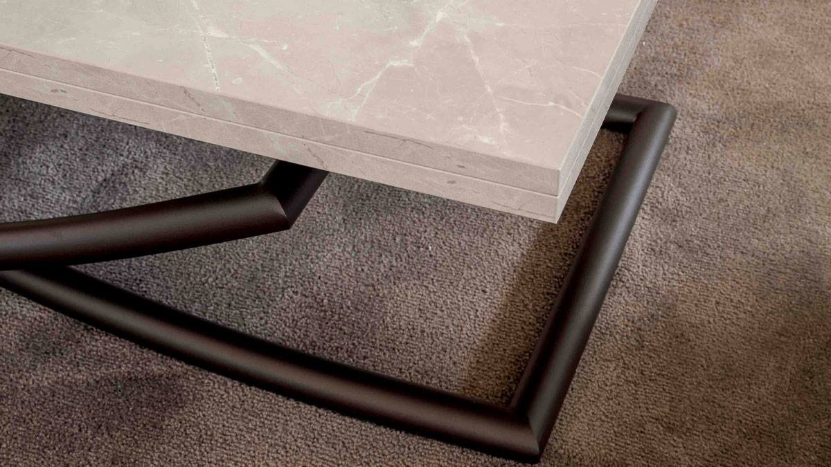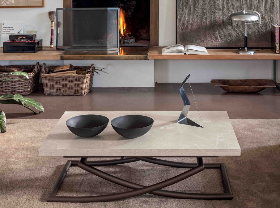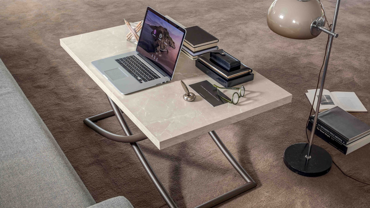 Tavolino trasformabile in tavolo da pranzo, base in metallo, meccanismo a gas, regolabile in altezza al millimetro da cm 35 a cm 75, piano raddoppiabile a libro in nobilitato, effetto malta, vetro o ceramica.