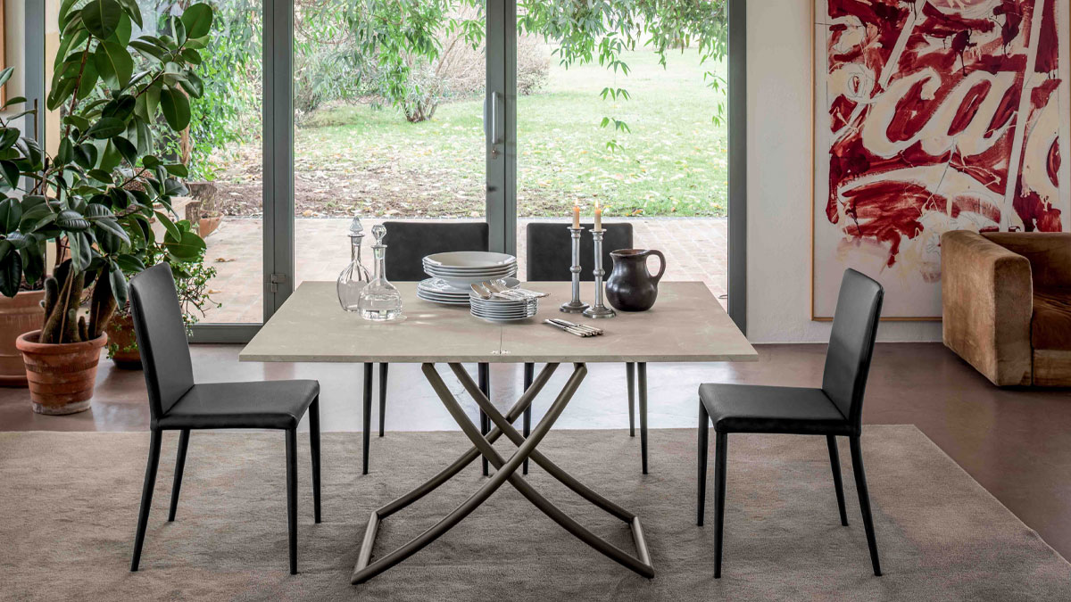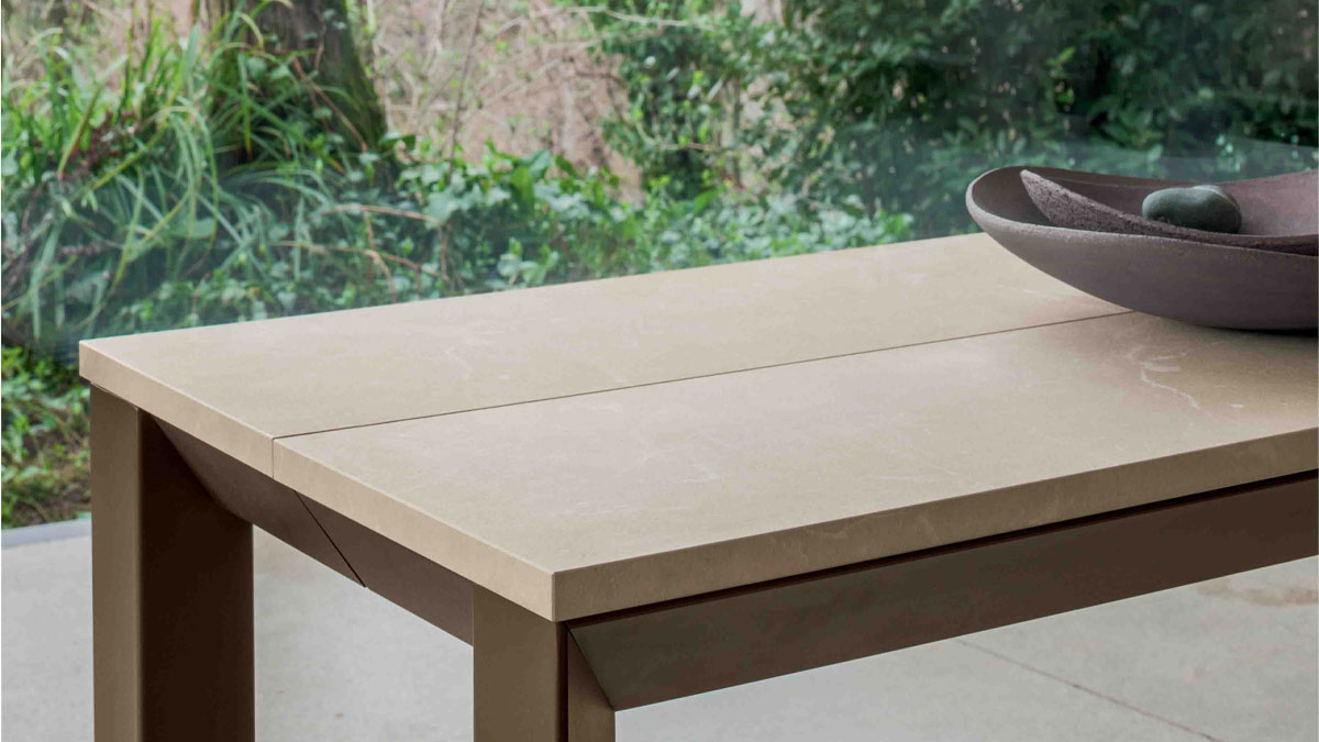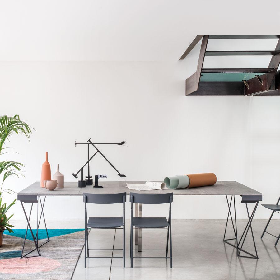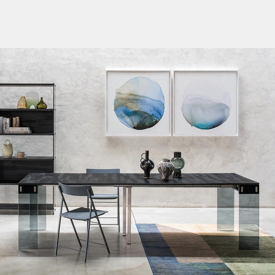 Consolle estensibile, struttura in metallo, meccanismo telescopico in alluminio, piano in nobilitato, laccato, legno, effetto malta o ceramica, 3 o 5 allunghe. Gambe centrali di supporto o porta allunghe opzionale Extenso.