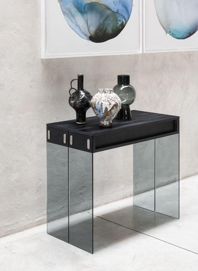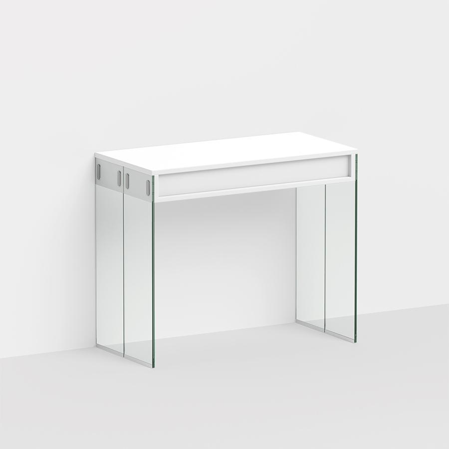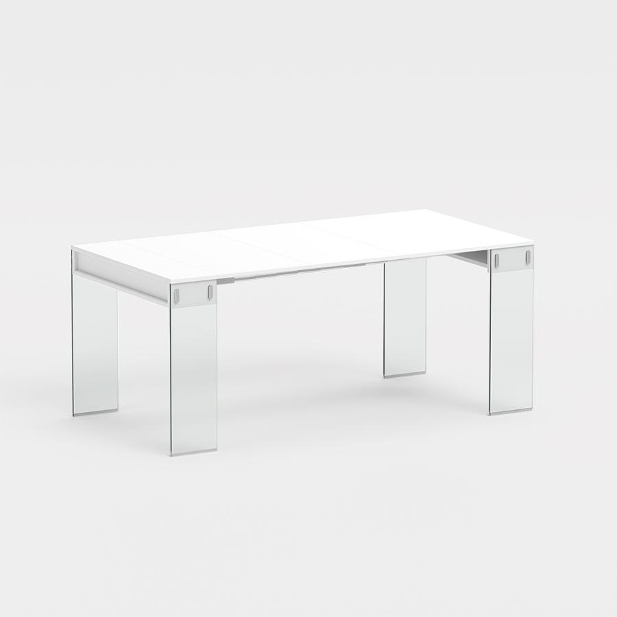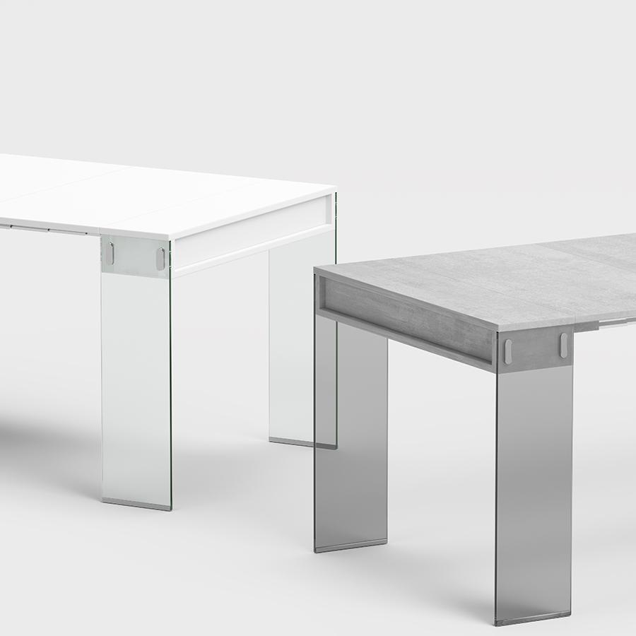 Consolle allungabile con struttura + 4 allunghe in laminato Ecologico da 18 mm. Per il pannello frontale e il top potete scegliere e combinare colori diverso da quello della struttura. Fianchi in vetro temperato sp. 10mm Gambe pieghevoli in acciaio inox, guida estensibile in alluminio Coperti: fino a 10 persone