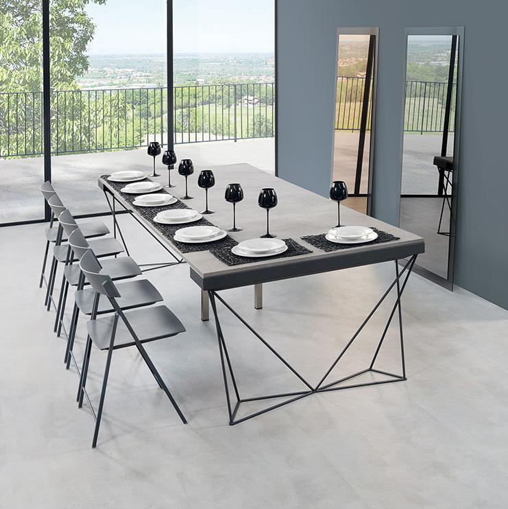 Consolle allungabile con struttura in acciaio laminato e tondo pieno da 12 mm verniciata con finitura sablé. Il top e le 5 allunghe in dotazione (da cm 45 cadauna), sono realizzate in laminato ecologico spessore 18 mm. Gambe pieghevoli di supporto in acciaio inox e guida estensibile in alluminio. Coperti: fino a 14 persone