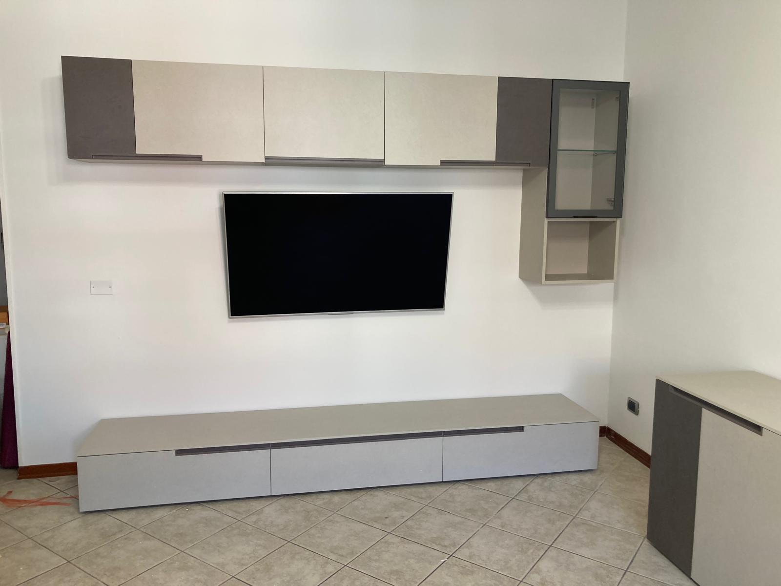 Mobile soggiorno formato da tre ante a terra di cui una a vasistas, moduli a giorno, una vetrinetta ad un'anta, un vano a giorno per TV. Struttura laccato opaco Ecru, ante a terra e ripiani laccato opaco Nebbia, schiene melaminico Dekor Bronzo, vetrinetta in vetro Fumè. Sistema di apertura Push Pull.
