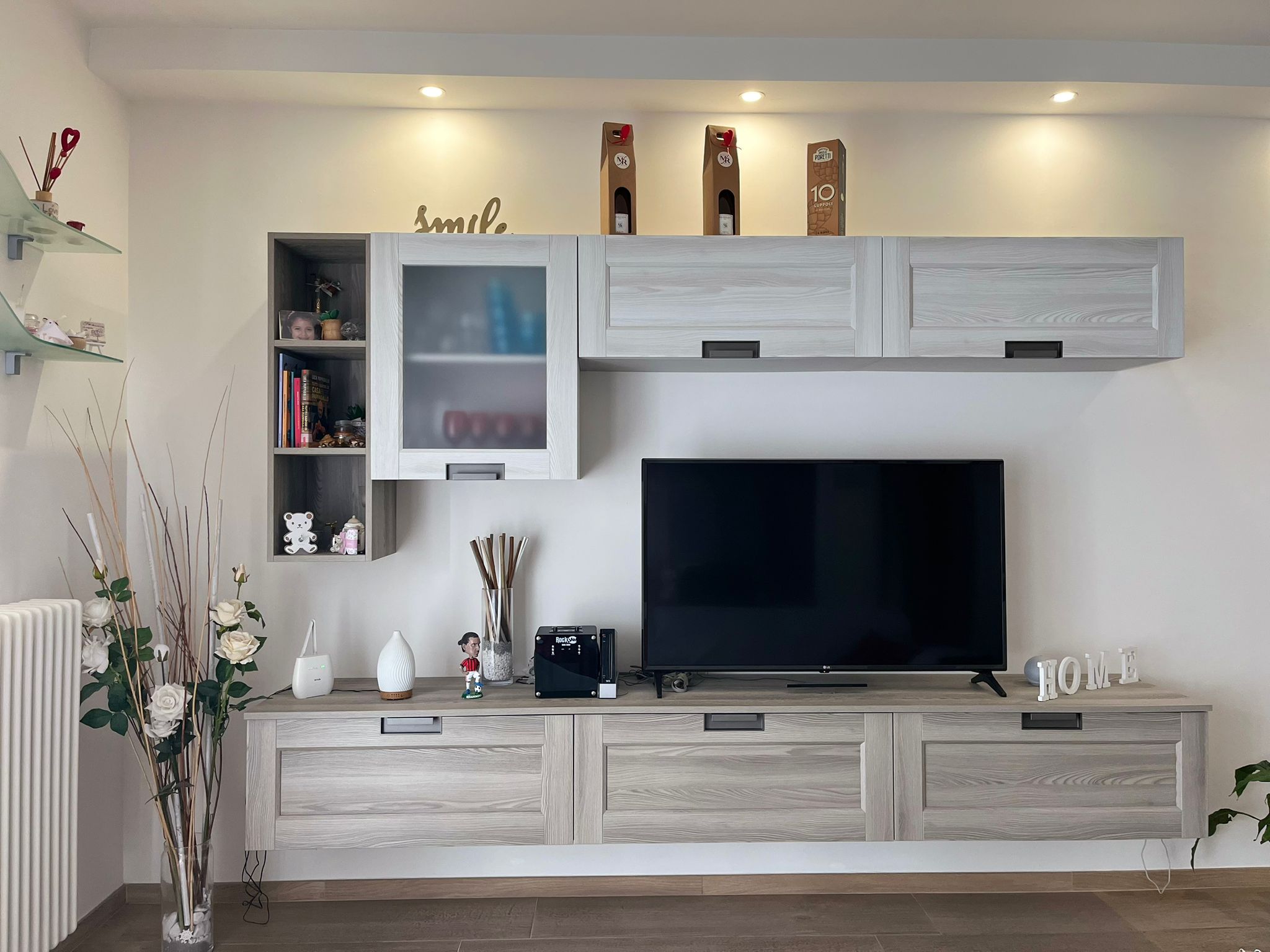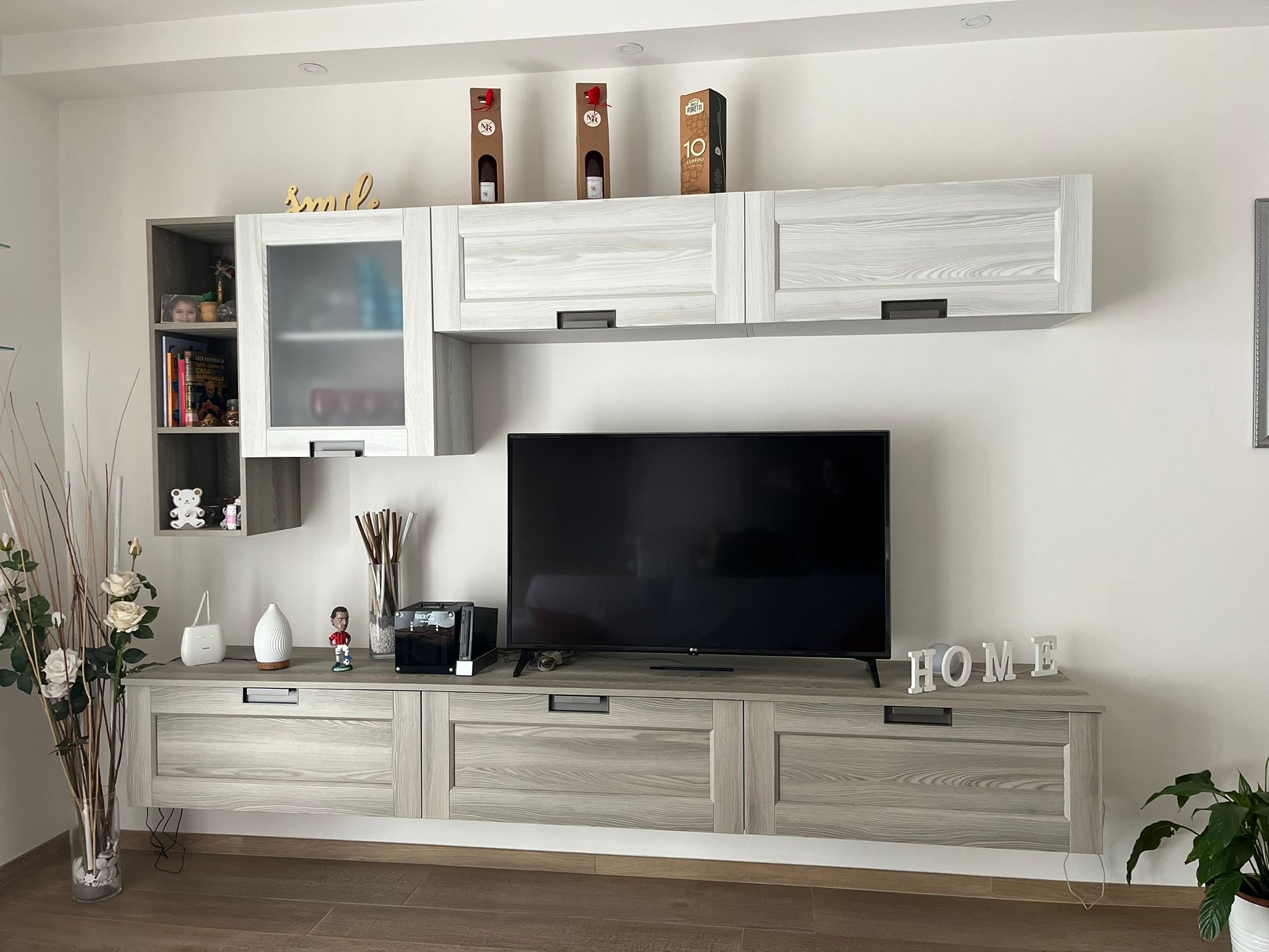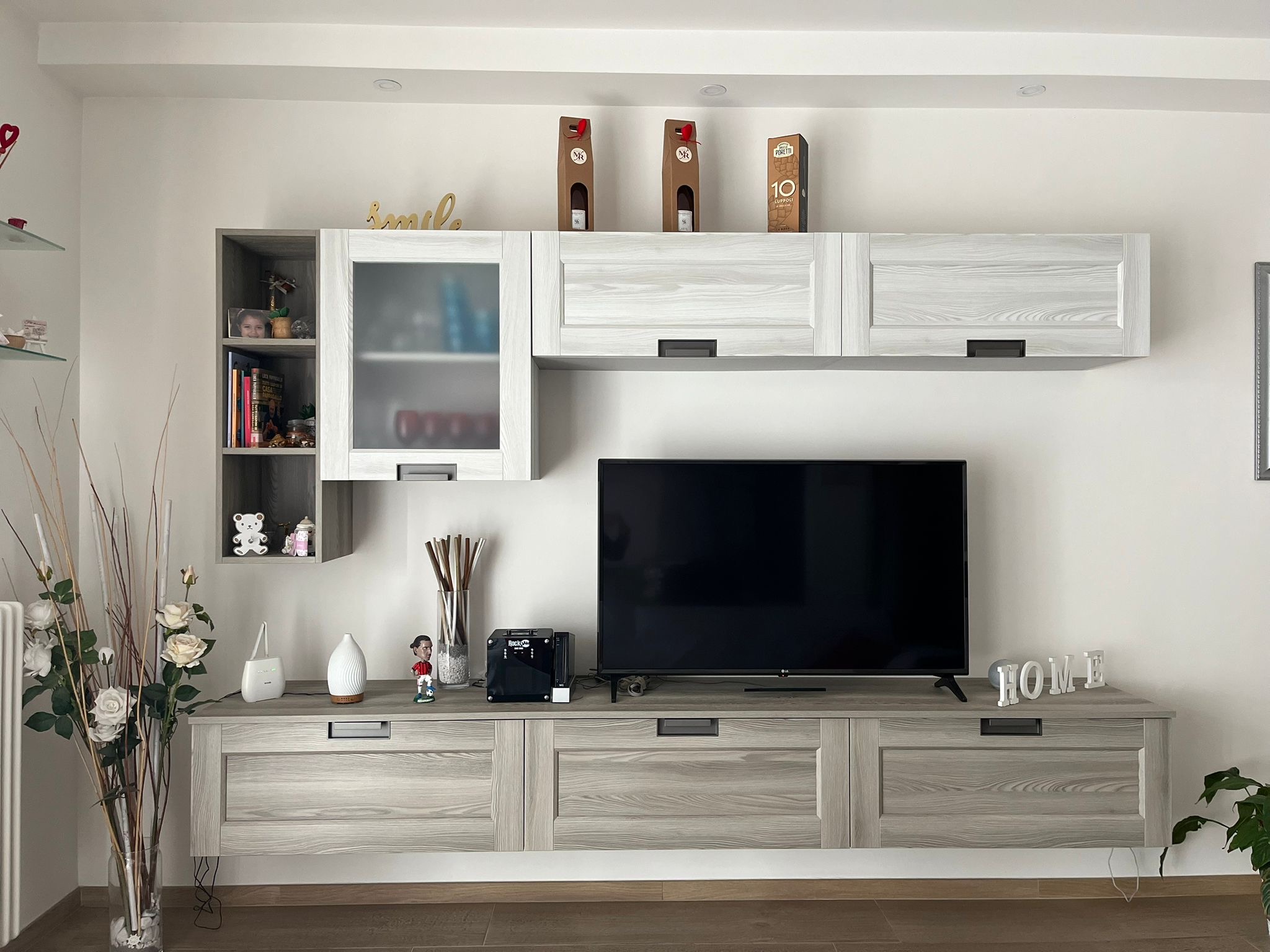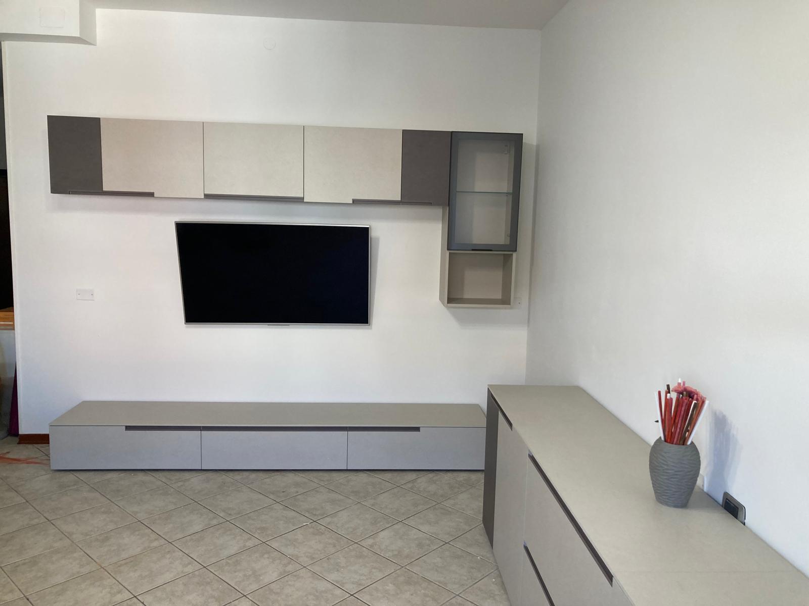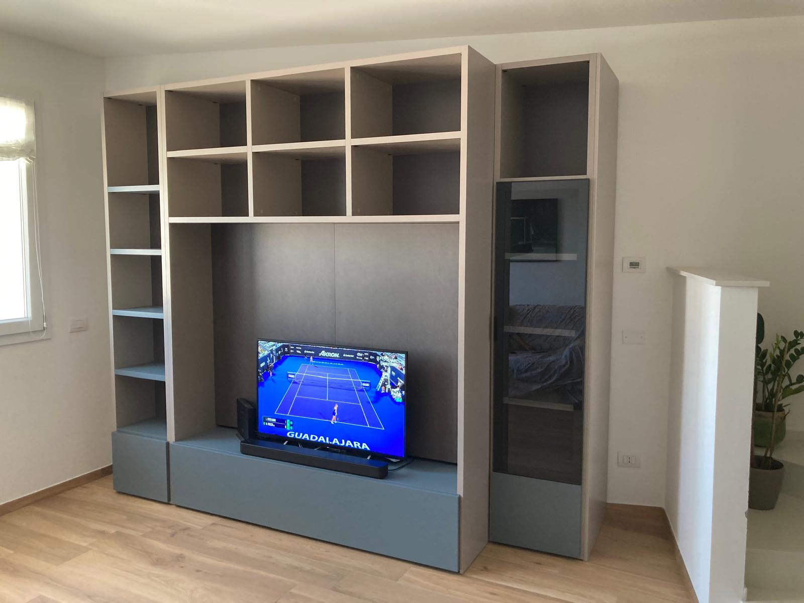 Mobile soggiorno formato da tre ante a terra di cui una a vasistas, moduli a giorno, una vetrinetta ad un'anta, un vano a giorno per TV. Struttura laccato opaco Ecru, ante a terra e ripiani laccato opaco Nebbia, schiene melaminico Dekor Bronzo, vetrinetta in vetro Fumè. Sistema di apertura Push Pull.