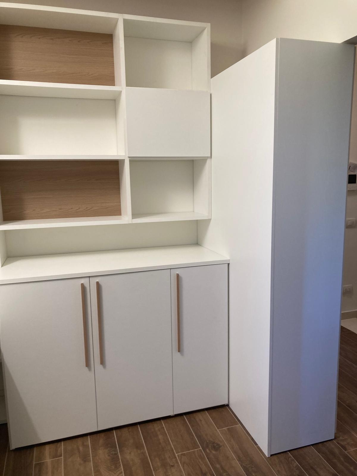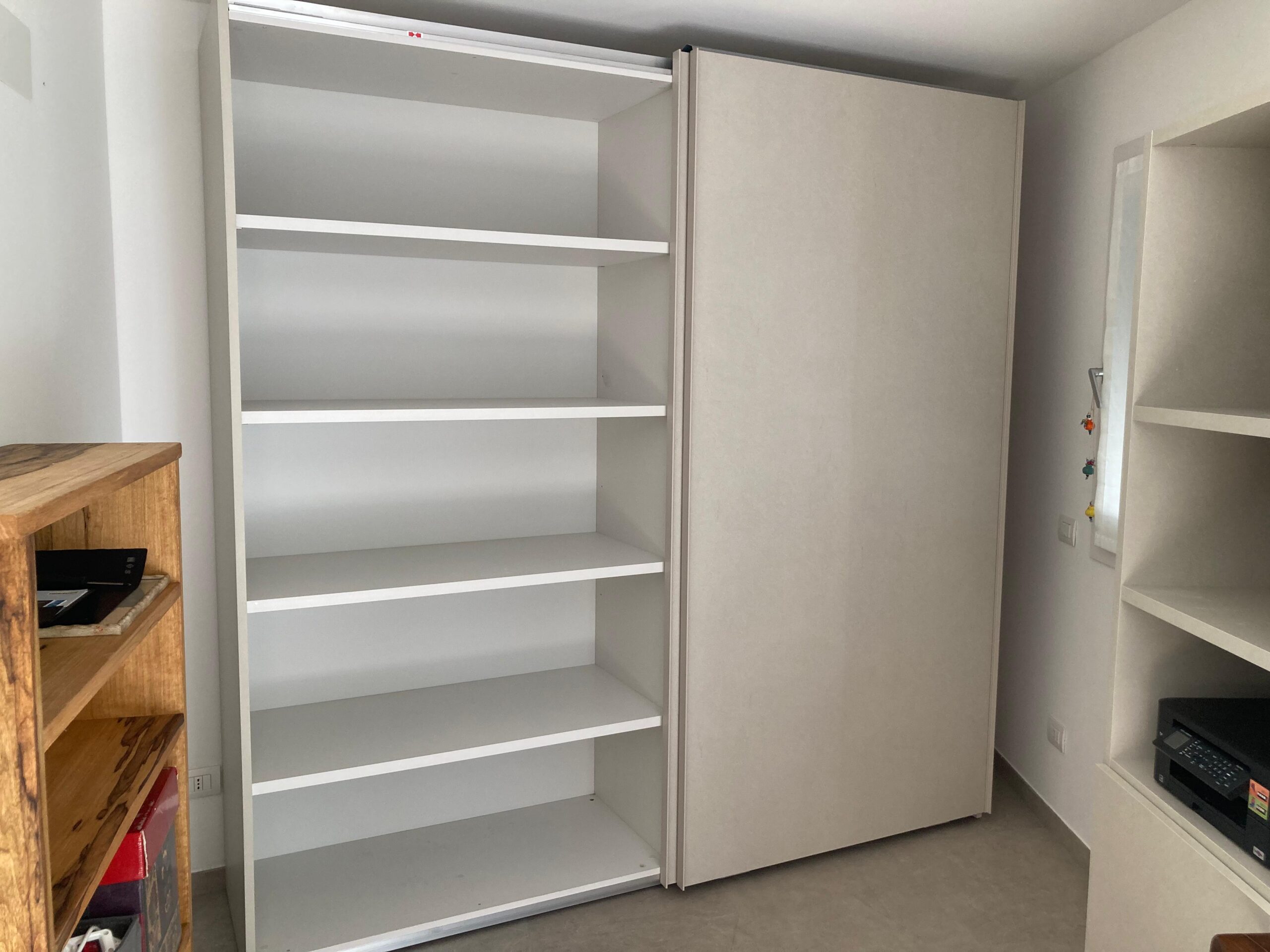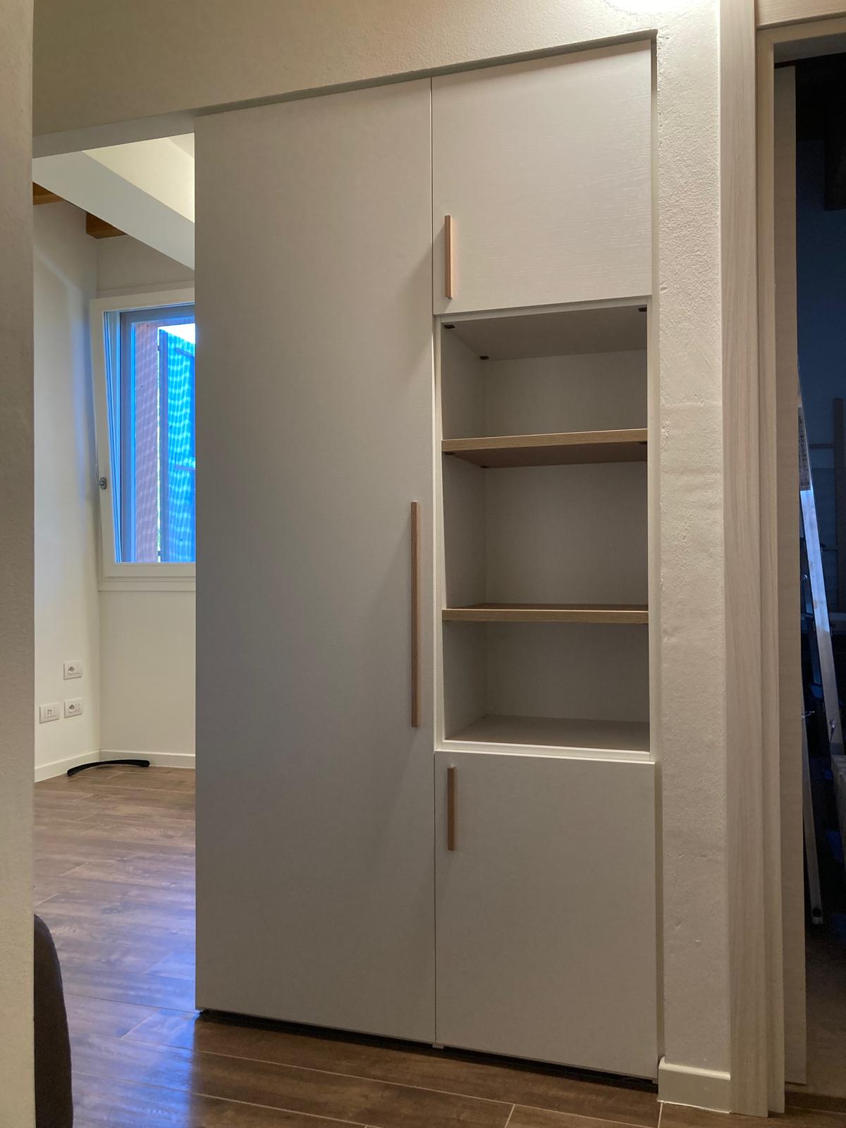 Cabina a tutta altezza in cartongesso con antine Magnolia, interno con ripiani in nobilitato sp.25mm