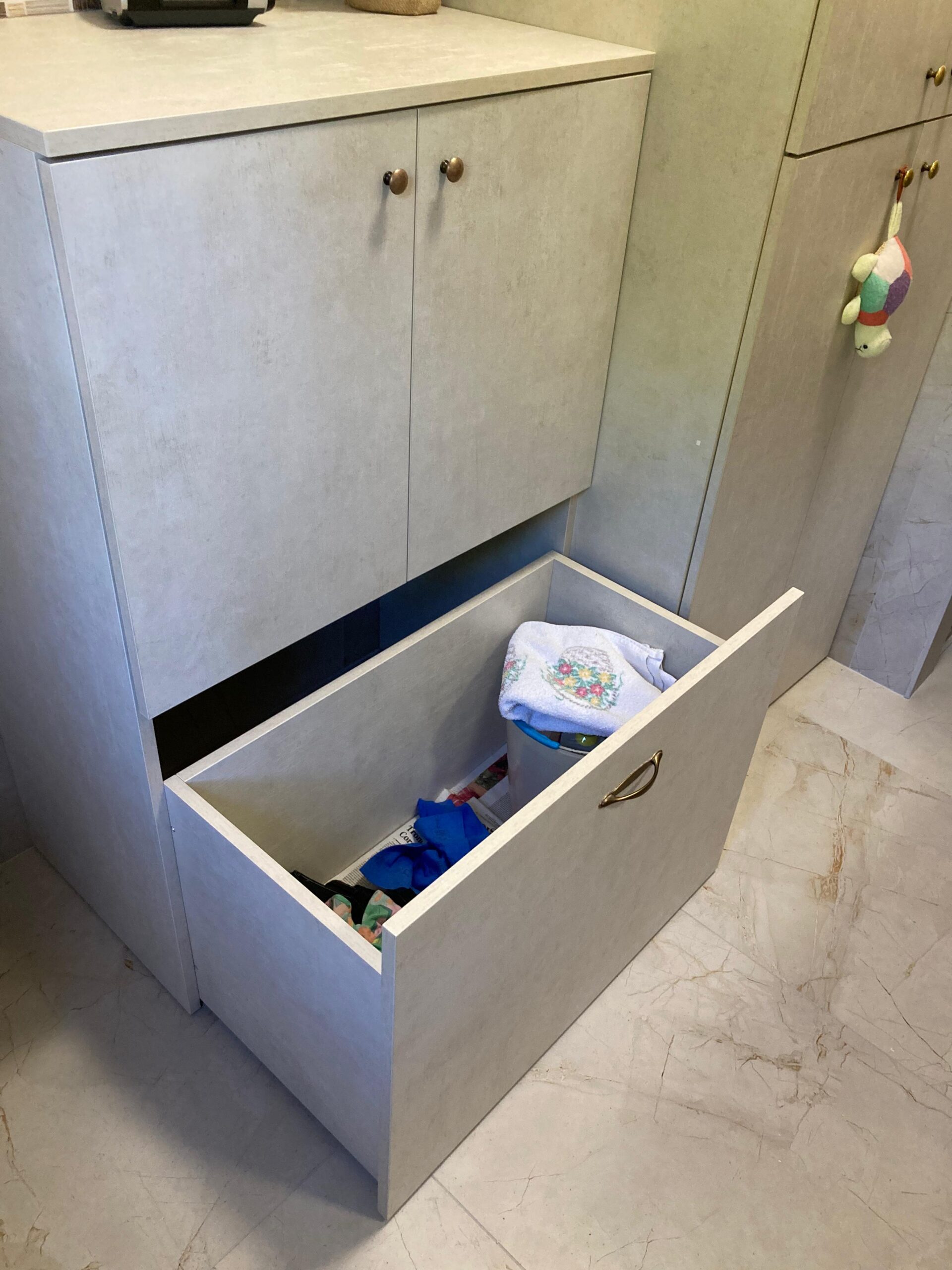 Cassettoni in laminato finitura Grigio Cashmere U702PM di cui uno con ruote in gomma dritte e l'altro con guide scorrevoli