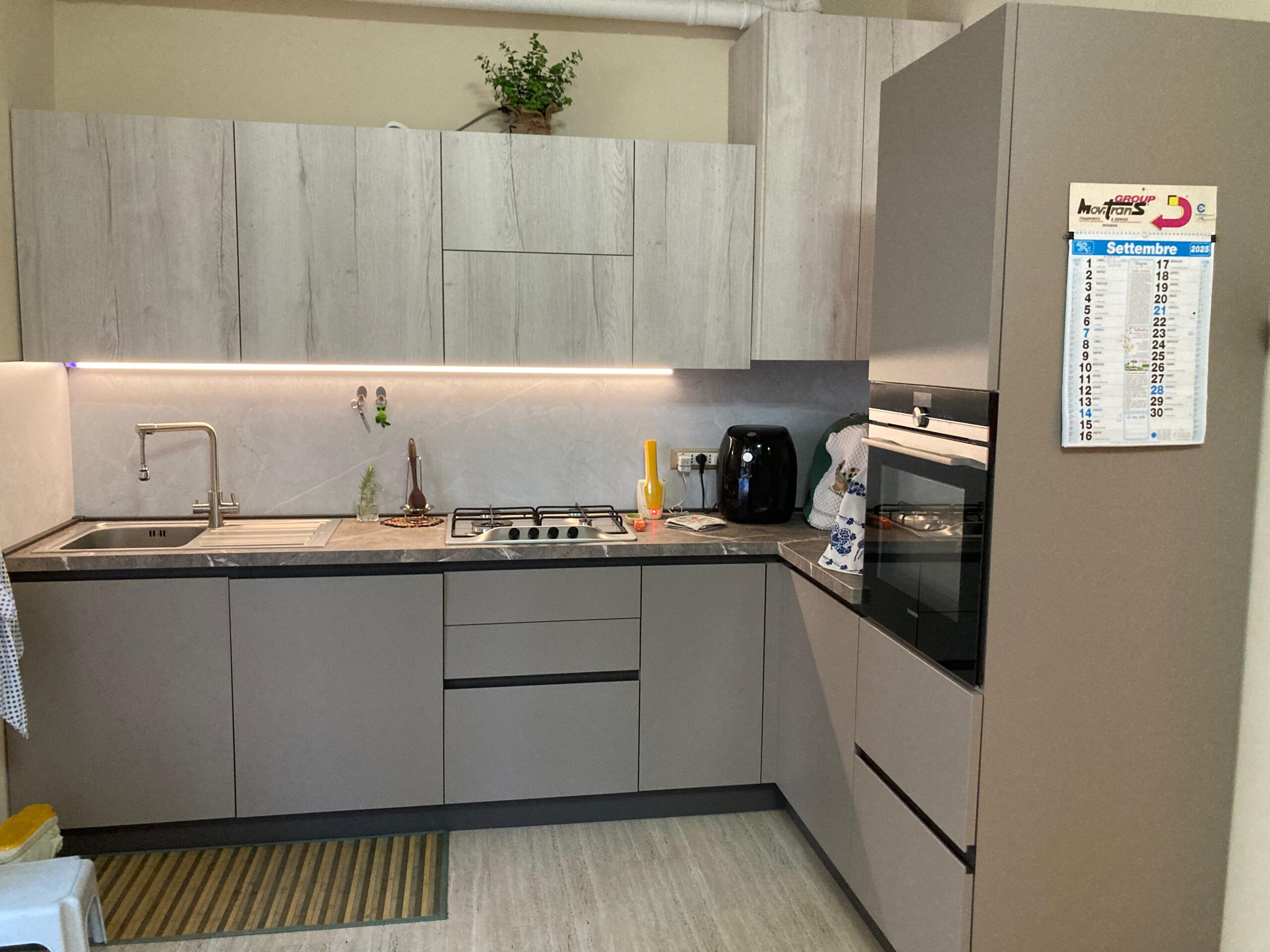 Cucina in Rovere Kamut con gola piatta e zoccolo Antracite . Top in laminato sp.4cm .