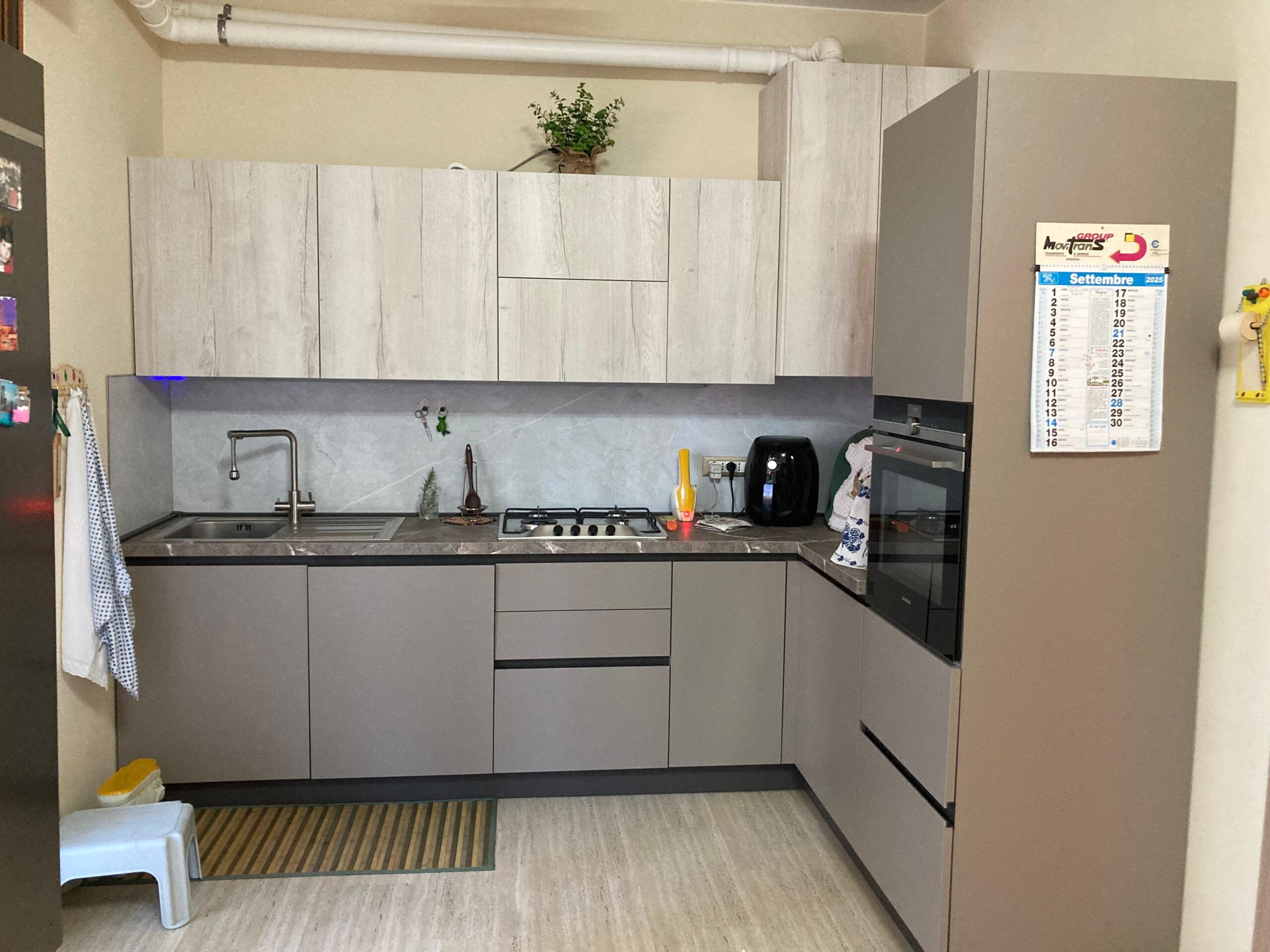 Cucina con ante basi in Rovere Kamut e pensili in laminato Grigio , top in laminato sp.4 cm con rispettivo schienale.