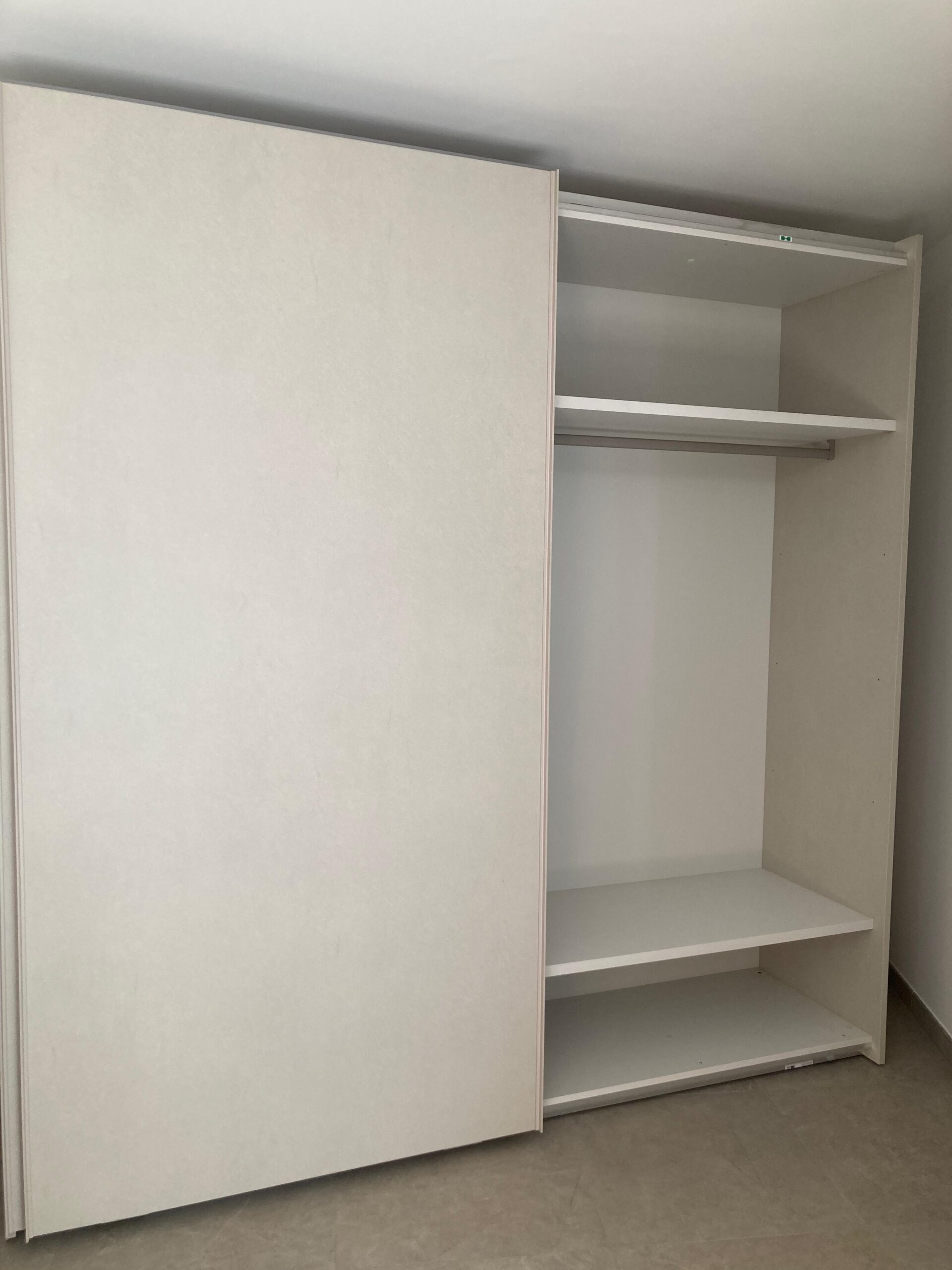 Armadio scorrevole a due ante, all'interno attrezzato c/ ripiani e tubo appendiabiti. Chiusura ante ammortizzata. Libreria a giorno c/schiene e un'anta. Il tutto in finitura melaminico Dekor Canapa.