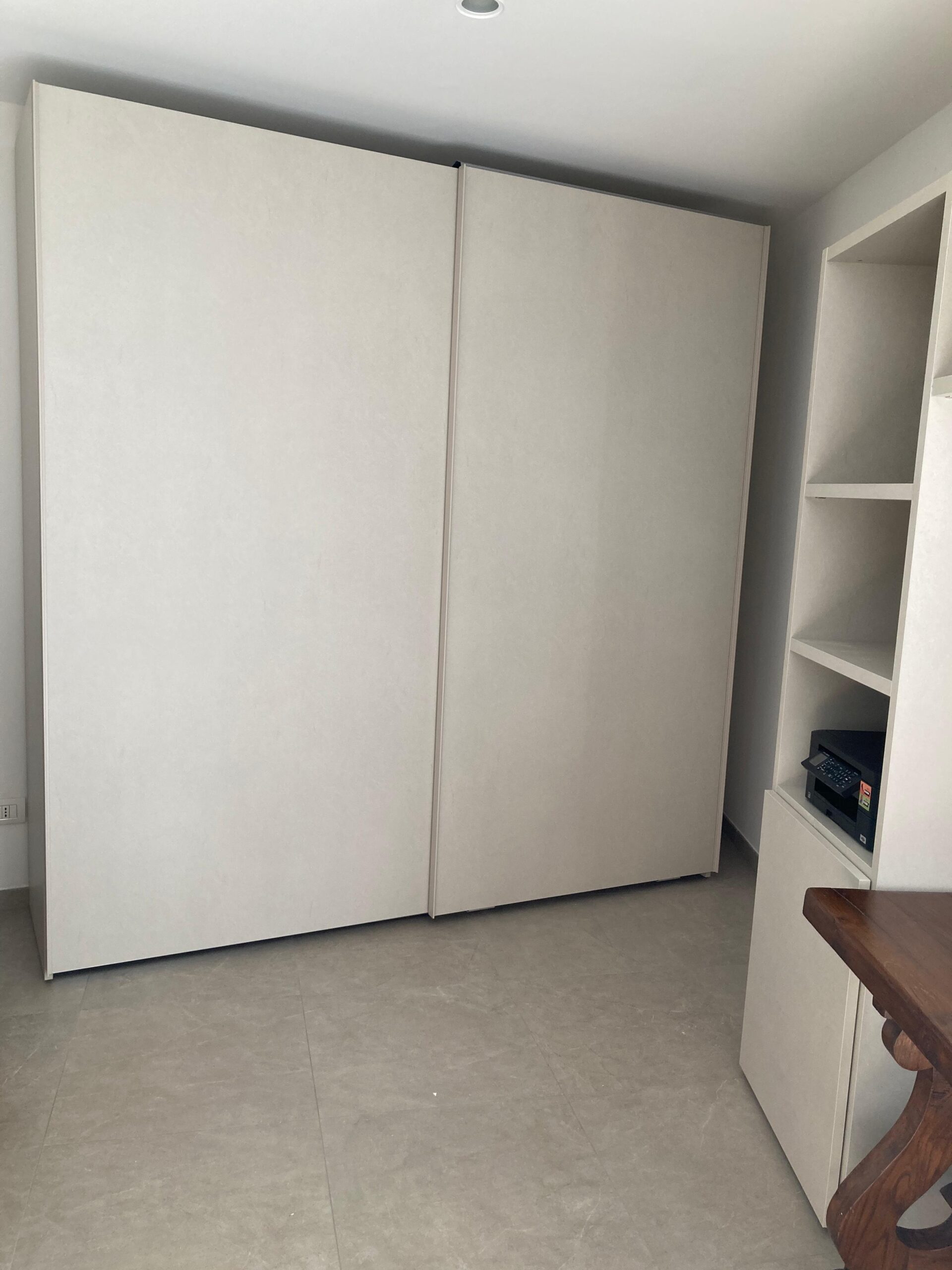 Armadio Morassutti con struttura e ante laccate Vaniglia Opaco con maniglia Step laccata Corda. La composizione prevede una porta integrata nell'armadio stesso che funge da passaggio nell'altra stanza.
