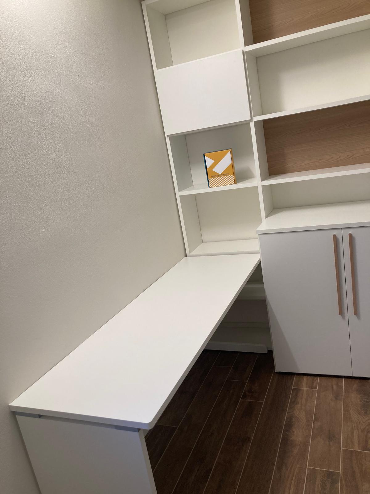 Mobili studio in essenza Bianco Frassino con maniglie Stylus Plus Rovere. Scrivania con piede C laccato Bianco.