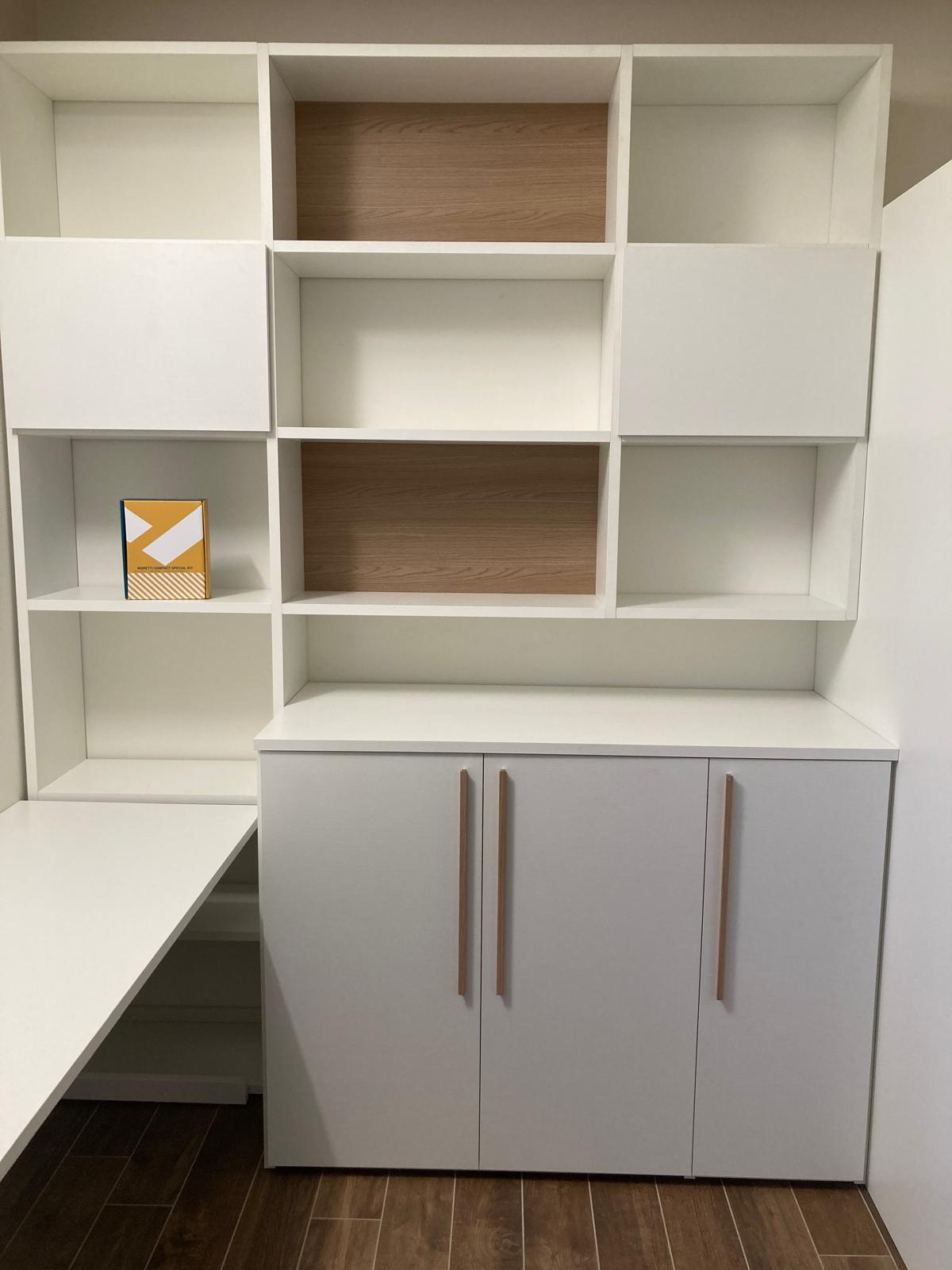 divisoria con due librerie Outline e un pannello porta in Bianco Frassinato della Moretti Compact.