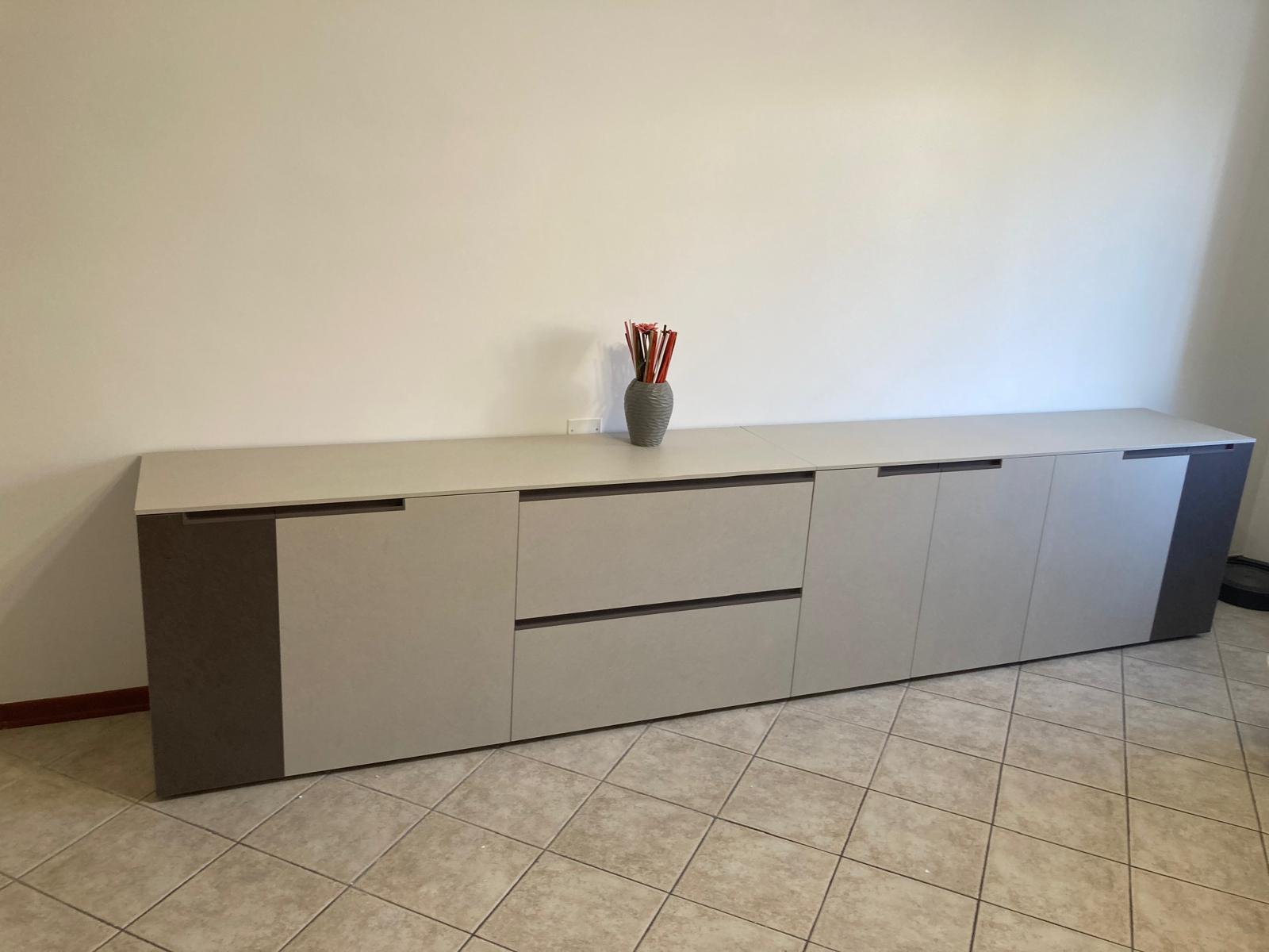 Base a 2 ante di L80, 2 cassettoni di L60, Base a 2 ante di L80. Misure totali: L220 x H90 x P60 cm. Finitura top: Nero Ardesia Finitura ante: Beige06 Finitura gola e zoccolo: Antracite