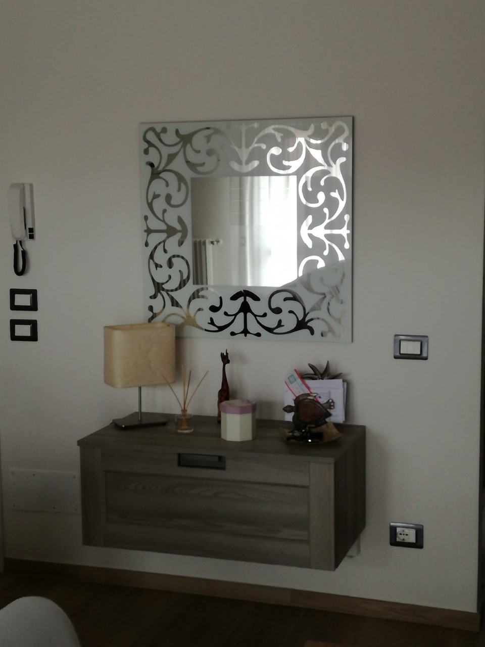 Appendiabiti modello Daisy Grigio Antracite con foglia argento. Wallbox Moretti Compact in laccato Corda, maniglia laccata Grafite.